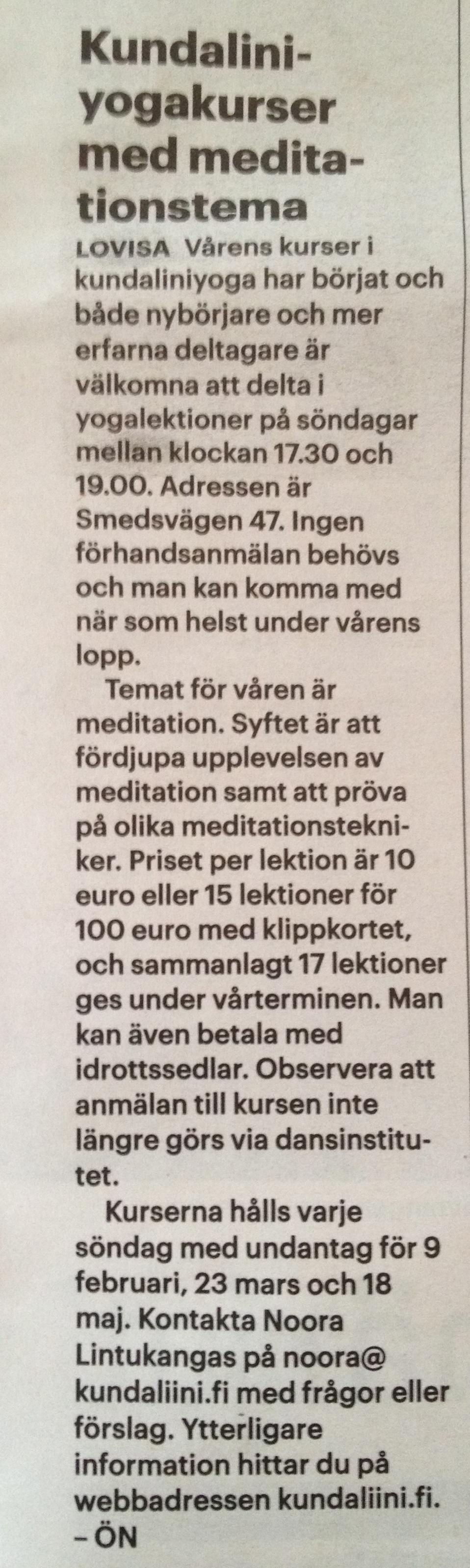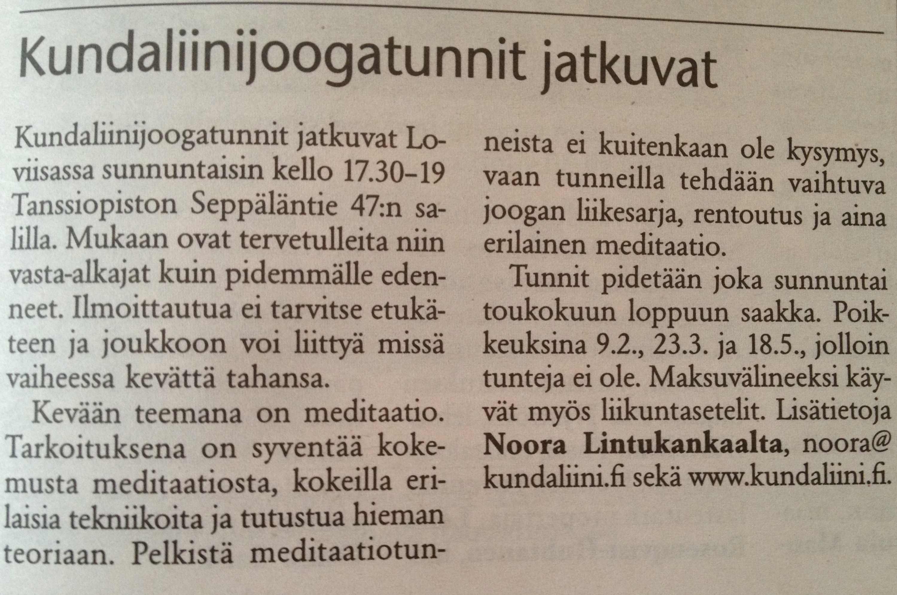 Molemmat paikallislehdet noteerasivat kundaliinijoogatuntien jatkumisen pienillä puffeilla. Uusia kokeilijoita oli näiden perusteella löytänytkin tunnille mukaan. Joukkoon mahtuu edelleen eli tervetuloa joogaamaan sunnuntaisin Seppäläntien salille!