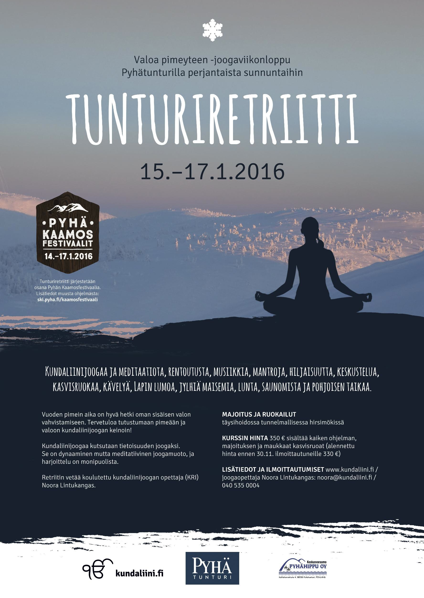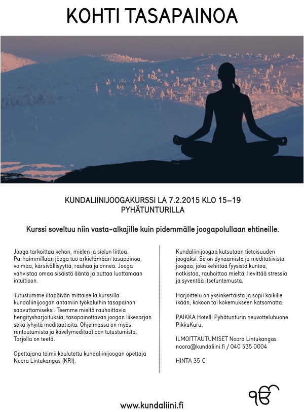 Sat Nam! Tammikuun 2016 Tunturiretriitti pidetään Pyhätunturin jylhissä maisemissa. Tarkempia tietoja ohjelmasta voi kurkistaa täältä. Aikaisen ilmoittautujan etu on voimassa marraskuun loppuun saakka. Tervetuloa mukaan!